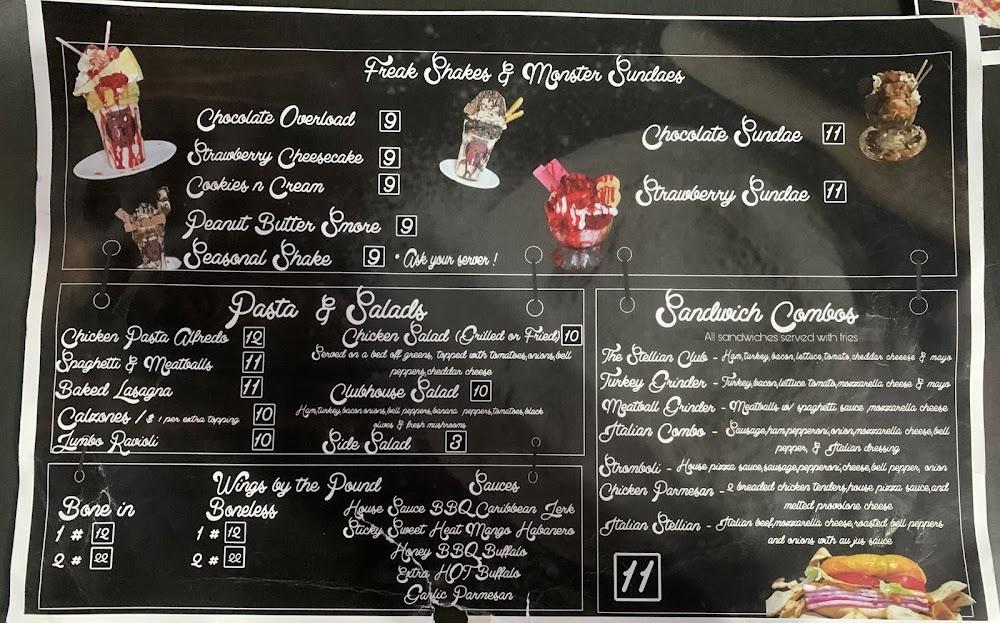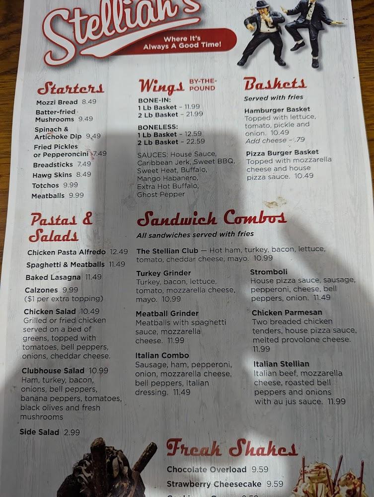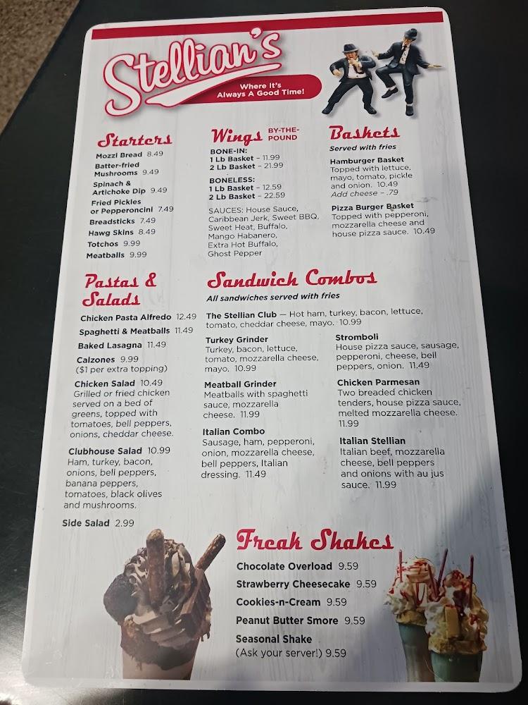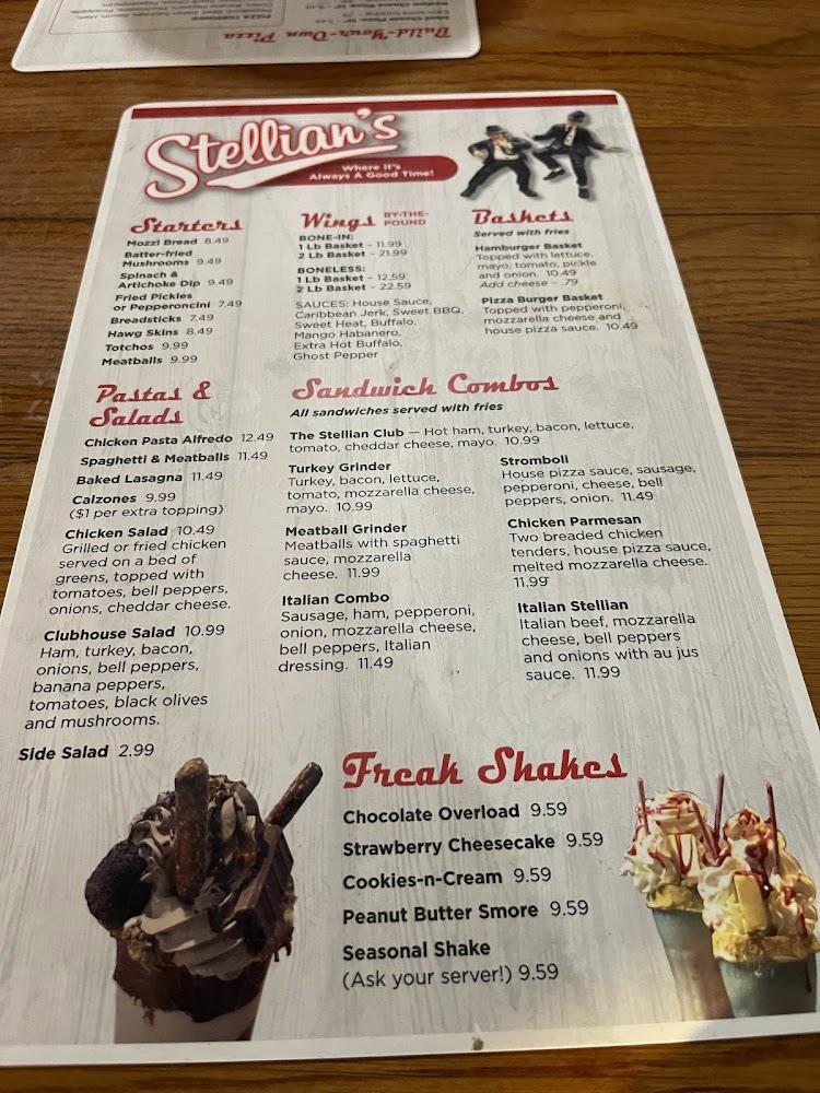 Stellian's menu bursts with classic Italian dishes. Notably, it features a variety of pizzas, from Chicago deep-dish to cauliflower crusts. Fans of pasta delight in items like Chicken Alfredo and hearty calzones.